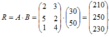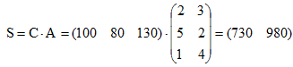 Решение. Затраты 1 –го сырья составляют S1=2∙100+5∙80+1∙130=730 ед., поэтому матрица-строка затрат сырья S может быть записана как произведение