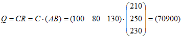 Тогда общая стоимость сырья Q=730∙30+980∙50=70900 ден. ед. может быть записана в матричном виде Q=S∙B=(CA)B=(70900).Общую стоимость сырья можно вычислить и в другом порядке: вначале вычислим матрицу стоимостей затрат сырья на единицу продукции, т.е. матрицу